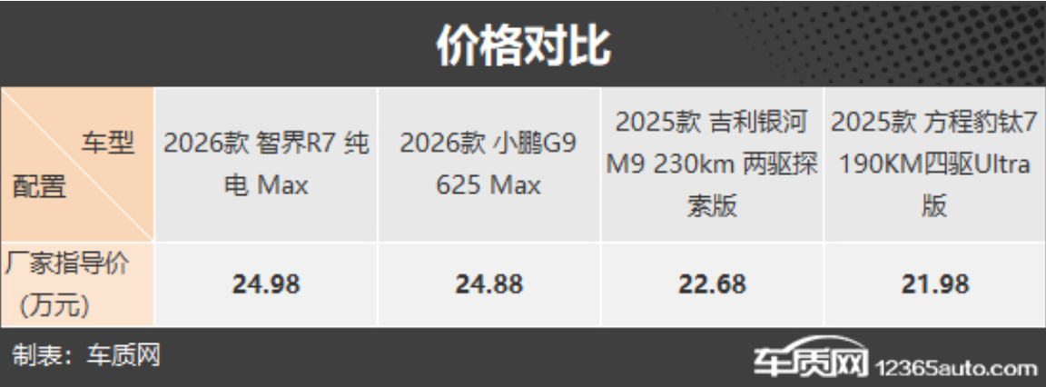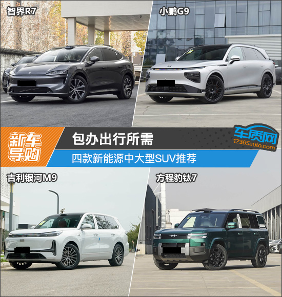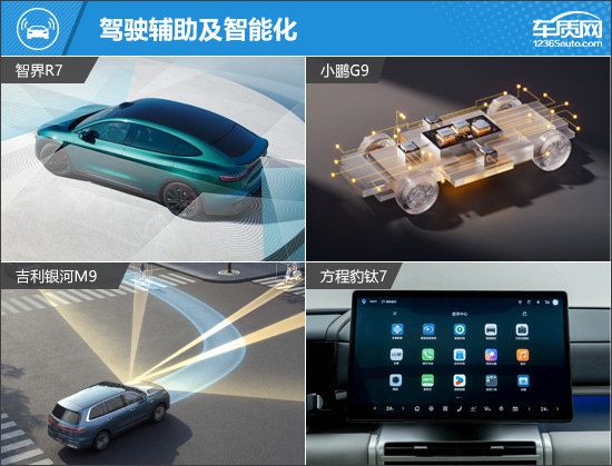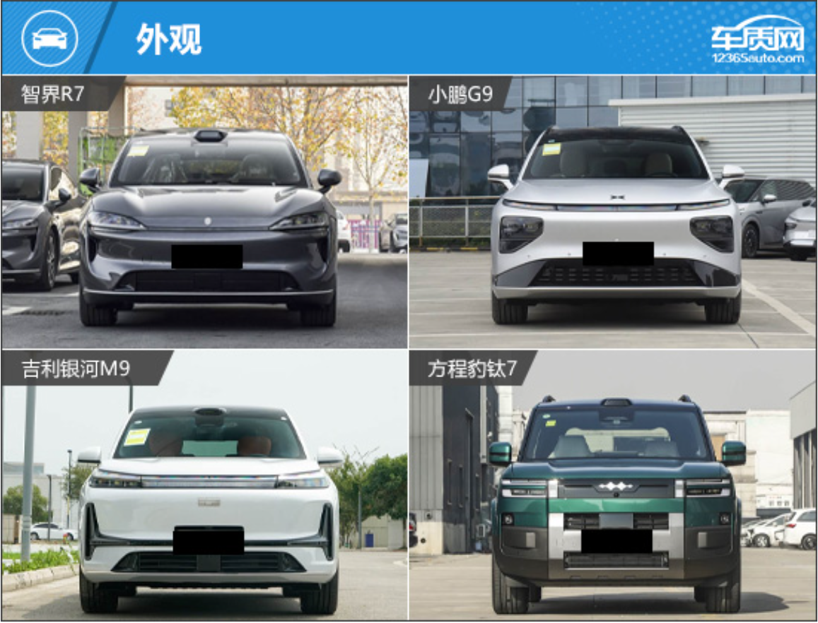 本次推荐的四款车型分别为智界R7、小鹏G9、吉利银河M9以及方程豹钛7。为兼顾不同用户的用车需求与补能习惯,前两款车型我们挑选的为纯电形式,后两款则为插电混动形式,覆盖城市通勤与长途出行等多种使用场景。