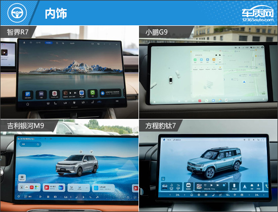 内饰层面,四款车型延续新能源时代常见的极简风格,整体布局趋同。用料方面均以软性材质为主,豪华氛围营造比较到位。细节差异方面,智界R7仪表台排布规整,椭圆形方向盘尺寸相对更为紧凑,视觉风格更显时尚;小鹏G9是唯一配备副驾娱乐屏的车型,而吉利银河M9搭载的一体式天际屏实现了类似功能效果,同时带盖板的杯架设计提升了中控台区域的整体感;方程豹钛7则在副驾驶前方增加额外储物空间,增强了日常取放物品的便利性。