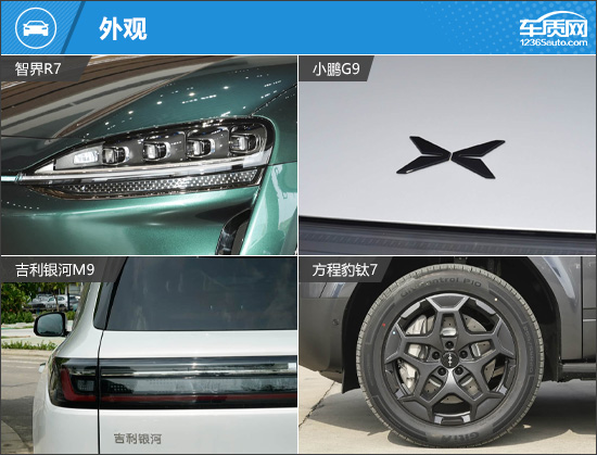 中大型SUV在造型层面往往强调豪华气场,而这四款车型在此基础上呈现出不同的审美取向。智界R7是唯一采用轿跑SUV姿态的车型,整体线条圆润流畅,车身比例动感,年轻气息更为浓郁;小鹏G9基于“生动力美学”理念打造,短前悬、长后悬的比例设计增强了体量感,整体观感大气饱满;吉利银河M9采用“星汉涟漪”设计语言,在融合东西方审美元素的同时,营造出更偏向家庭化的亲和氛围;方程豹钛7则以“星际方舟”设计理念为核心,造型刚劲有力,视觉风格更具硬派气质,是四款车型中个性最鲜明的。