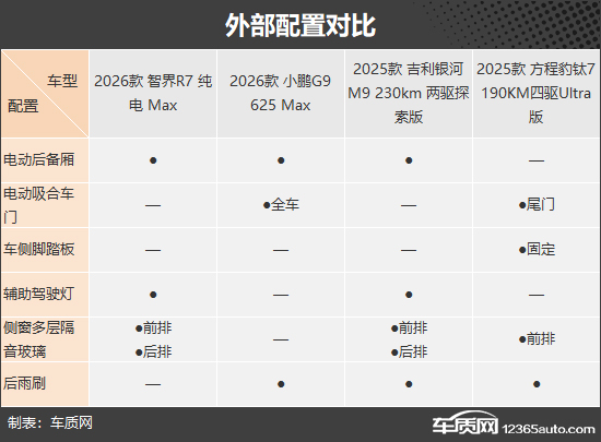在外部配置方面,四款车型整体水准接近,均能提供较为完善的日常使用体验,不过在细节设定上各有侧重。小鹏G9是唯一配备全车电动吸合车门的车型,在仪式感与高级氛围营造上更强;方程豹钛7提供固定车侧脚踏板,提升了乘员上下车的便利性。相比之下,智界R7未配备后雨刷,在雨雪天气下可能对后方视野造成一定影响。