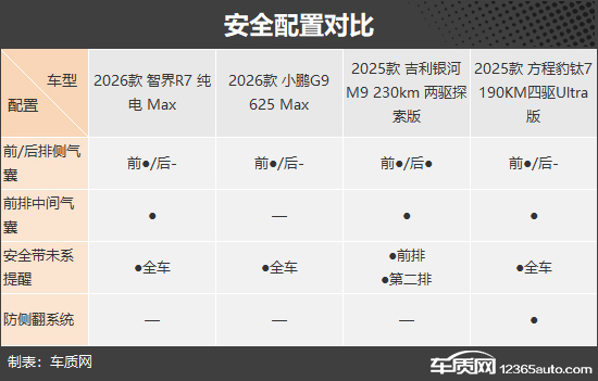 安全配置方面,四款车型整体表现均较为完善,能够提供相对全面的安全保障。对比来看,吉利银河M9在被动安全配置层面覆盖更为丰富,基础防护更令人安心;方程豹钛7则因配备防侧翻系统,在主动安全方面具备一定优势,进一步强化了行驶稳定性与安全冗余。