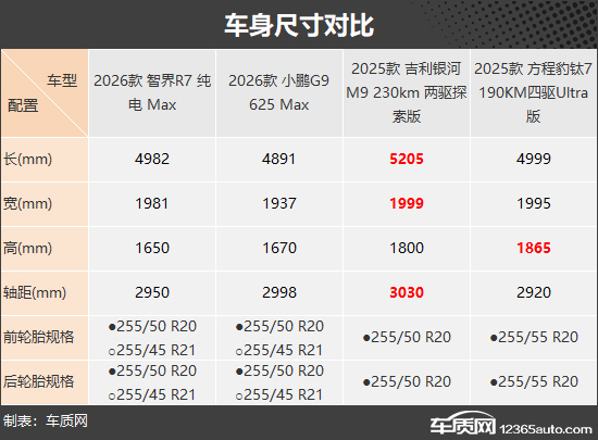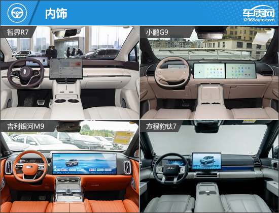 性能方面,吉利银河M9与方程豹钛7采用插电混动形式,后者依托高性能电机与前置四驱结构,动力表现最为强悍;吉利银河M9则在CLTC综合续航表现上更为亮眼,有助于缓解长途出行的续航焦虑。智界R7与小鹏G9为纯电版本,核心优势体现在支持高压快充,补能效率较高,同时出行成本相对更低,更适合以城市通勤为主的使用场景。