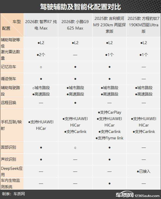 智能化方面,吉利银河M9表现出色,不仅支持丰富的手机互联/映射方式,还独享车内生物监测系统,智能体验在线;方程豹钛7已接入DeepSeek应用,与AI生态接轨;小鹏G9在智能化配置上相对欠缺,整体体验略显不足。