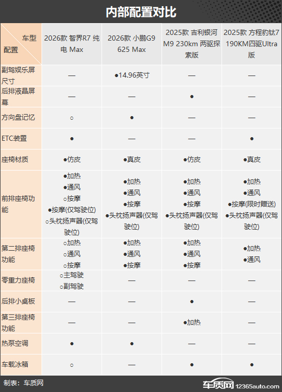内部配置方面,智界R7基础配置覆盖相对有限,多项功能需要通过选装才可实现。不过,它也是四款车型中唯一支持加装主、副驾驶零重力座椅的车型,选择更加灵活。吉利银河M9整体配置表现最为全面,不仅提供第三排座椅,还拥有多项专属功能,综合实力突出。小鹏G9与方程豹钛7则维持相对均衡的配置水准,应对日常家庭用车需求没有明显短板。